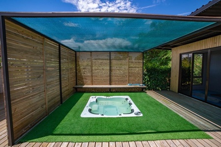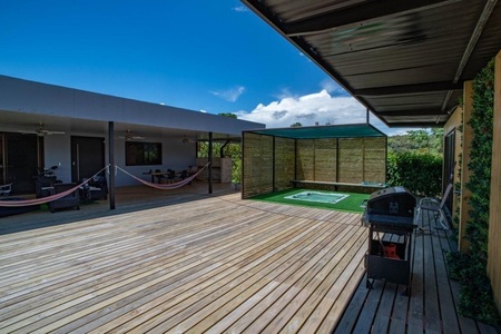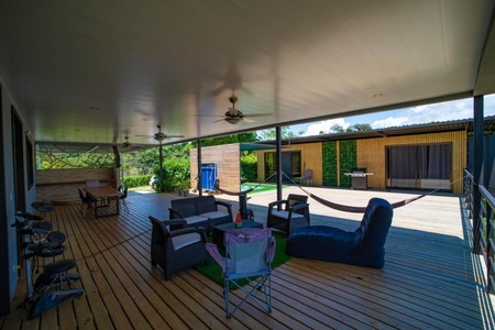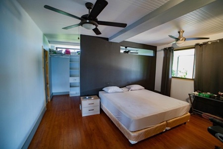 The interior surface is 190 m2 (2045 sqft ), with a terrace of 130 m2 (1040 sqft) of which 60m2 (640sqft) are with roof. The the main house and the guest room/ exercise room are separated by the terrace with the main part of 164m2 (1765 sqft)with 3 bedrooms, 2 bathrooms, a large living / dining / kitchen, a cinema room (possibility of converting into a bedroom if necessary), and a scullery. with a storage room and laundry. On the other side of the terrace there is a separate suite with bathroom and dressing room as well as a small gym with TV which can also be converted into a bedroom or office. There is a 5 seater Jacuzzi embedded in the terrace. The house sits on stilts with sea view and made of refrigerated container (therefore well insulated). Solar water heater ! Land area = 2624m2 or 28244sqft.